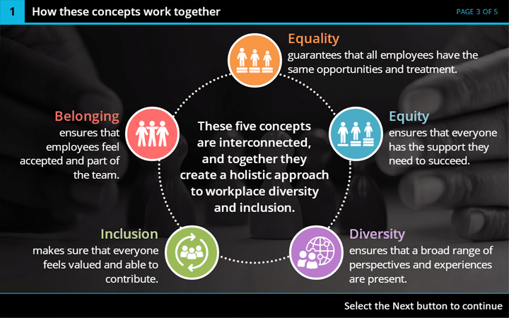 Successfully completing the assessment demonstrates your understanding of how to promote equality, prevent discrimination, and support an inclusive and diverse workplace, and allows you to receive your course certificate.