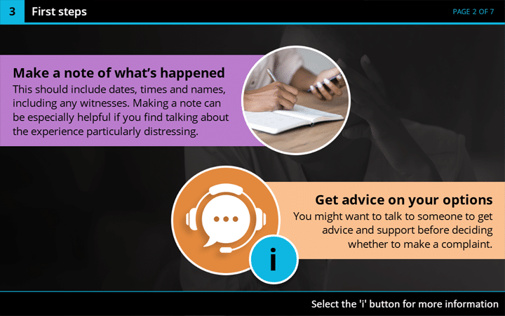 This chapter guides you through the steps to take if you experience or witness discrimination, harassment, or other prohibited conduct in the workplace. You’ll learn how to raise a concern, access advice and support, and follow your organisation’s policies and procedures effectively.