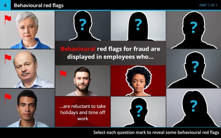 Following this, you’ll undertake an exercise where you need to identify whether you believe the statement shown is a behavioural, operational or financial red flag. This will help raise your awareness of the different types of red flag that could indicate fraud is occurring.