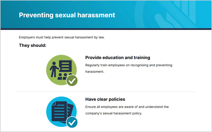 Next, you’ll look at information and statistics to explain how often sexual harassment may happen and why. Then you’ll explore the ways you can recognise inappropriate behaviour, and look at the differences between overt and subtle forms of sexual harassment, as well as sexual harassment ‘red flags’ to help you recognise when inappropriate conduct may be happening.